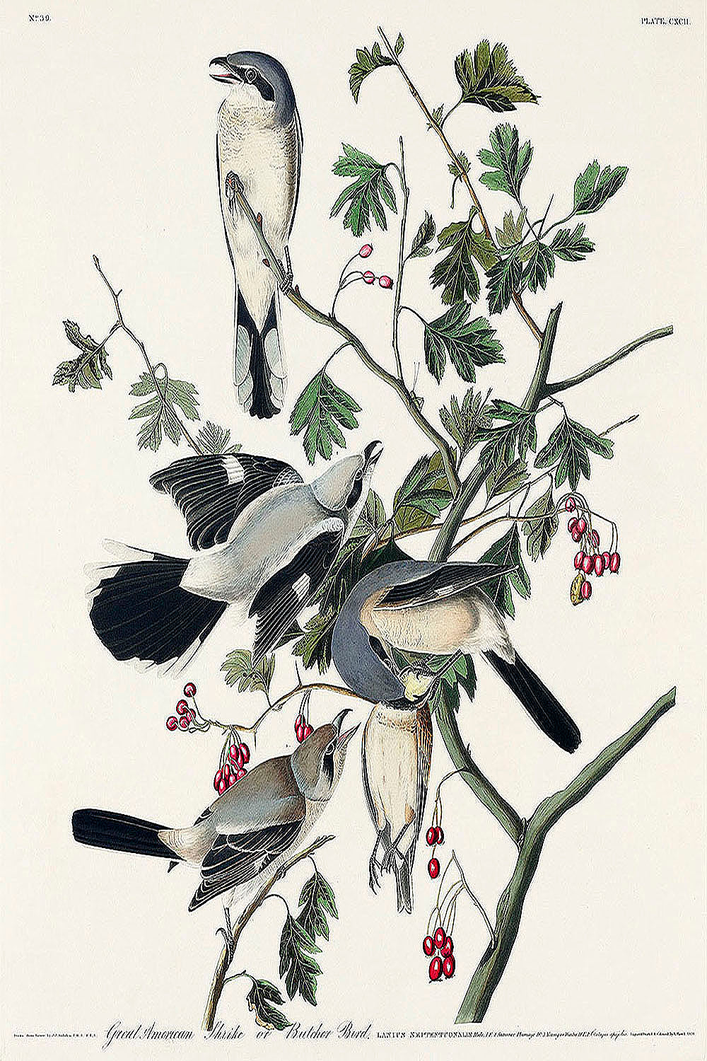 Great cinereous Shrike, or Butcher Bird from Birds of America (1827) by John James Audubon
